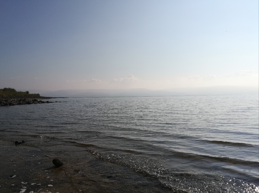 Kapernaumissa Genesaretin rannalla viikunapuun alla. Helteinen usva peittää